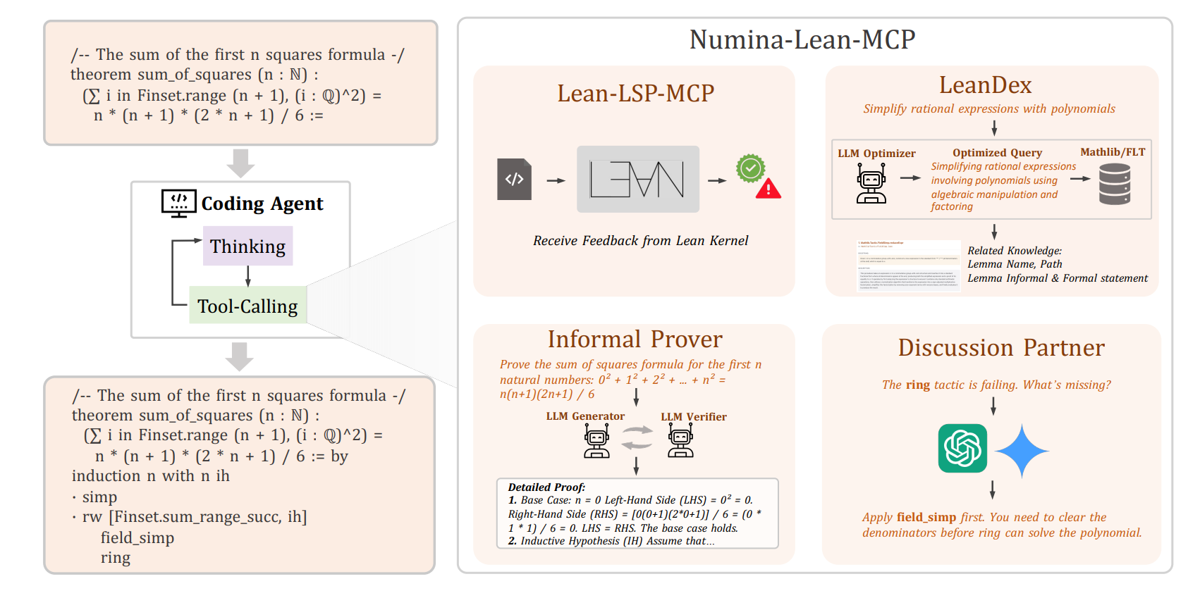 除了一般的形式化自动定理证明任务之外,Numina-Lean-Agent 还可作为一个通用的数学推理系统,支持数学家进行交互式的“vibe proving”。利用该系统与人类专家协作,在两周时间内完成了对数学所何伟鲲副研究员的论文Effective Brascamp-Lieb inequalities形式化,展示了强大的人机交互能力。