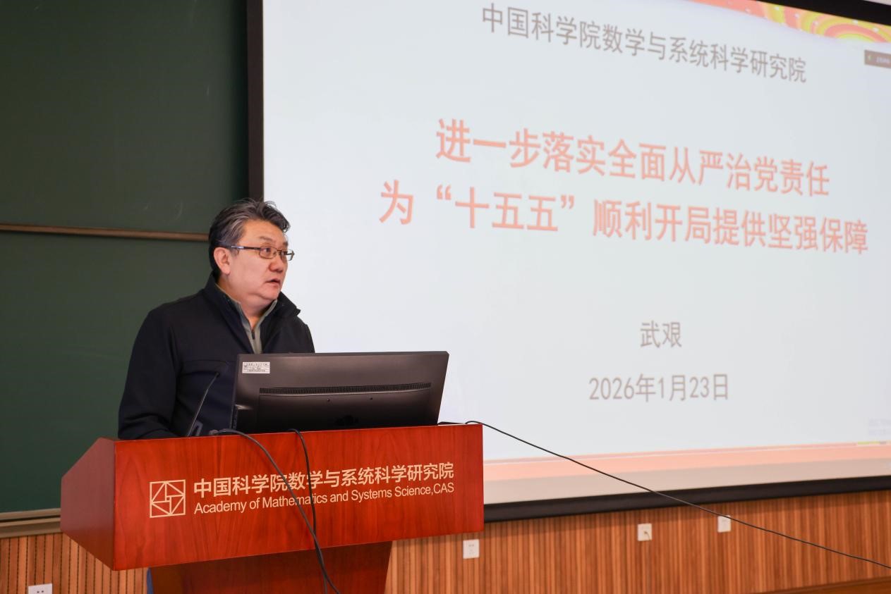 2026年1月23日下午,中国科学院数学与系统科学研究院(以下简称“数学院”)召开中心组学习扩大会。学习主题是深入学习《中国共产党章程》,贯彻党的二十届四中全会精神;深入学习习近平总书记在二十届中央纪委五次全会上发表的重要讲话精神;深入学习习近平总书记关于全面从严治党重要论述;认真学习中国科学院关于院属单位党委落实全面从严治党责任、发挥战斗堡垒作用的相关文件精神;深入学习中国科学院党组冬季扩大会议精神。数学院领导班子、党委委员及中层干部参加了会议,会议由党委书记兼副院长武艰主持。