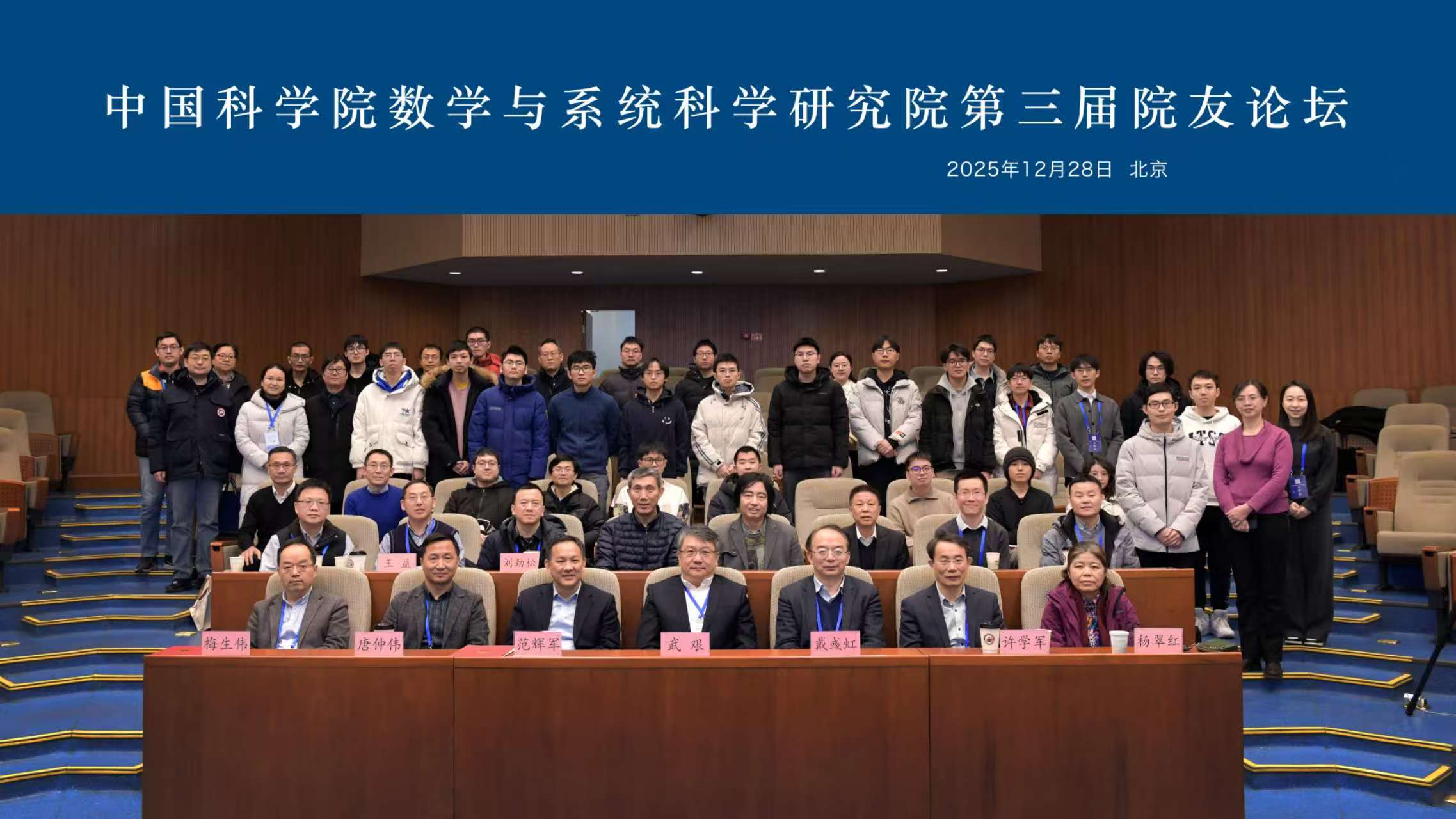 2025年12月28日上午,中国科学院数学与系统科学研究院(以下简称数学院)第三届院友论坛暨“纵横数海”院友科普报告会在思源楼报告厅举行。数学院党委书记兼副院长武艰、副院长黄飞敏研究员、副院长戴彧虹院士、副院长杨翠红研究员,数学所所长付保华研究员、副所长刘劲松研究员,应用数学所所长骆顺龙研究员、副所长王益研究员,系统所副所长李启寨研究员、国科大校友会办公室孙燕新老师,中国人民大学吴武清教授,光大金控资产管理有限公司董事副总经理岳志强等40余位来自高校和业界的院友代表与数学院师生代表共同参加。院友论坛由黄飞敏研究员主持。