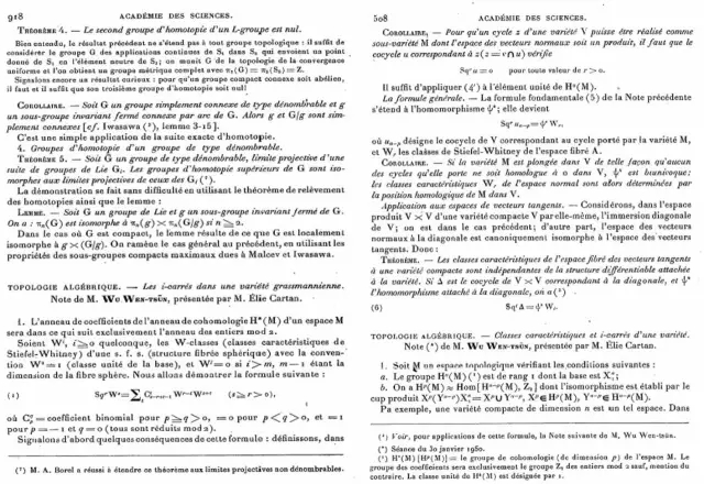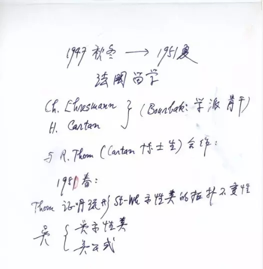 1949年秋天,也就是我到法国的近两年后,我离开清净的小镇斯特拉斯堡,到了巴黎,跟H.嘉当(Henri Cartan)先生工作和学习了两年。我在这两年间做出了非常了不得的工作,被称作“吴方法”,出名了,在法国,也在整个拓扑界成了名人。