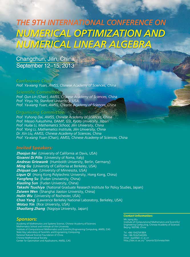 第九届数值优化与数值代数国际会议(the 9th International Conference on Numerical Linear Algebra and Optimization ) 将于 2013年9月12-15日在吉林长春举行。这是在我国举行的以数值优化与数值线性代数为专题的系列优化会议,前八届会议分别在青岛(1997)、南京(1999)、敦煌(2001)、桂林(2003)、拉萨(2005)、乌鲁木齐(2007)、丽江(2009)、厦门(2011)举行。