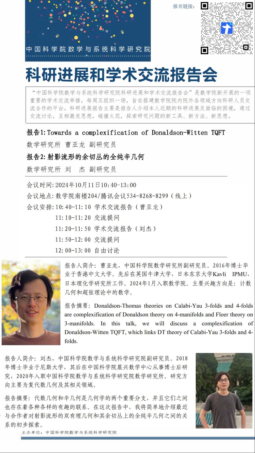 【2024.10.11-10.11 北京&腾讯会议】数学院科研进展和学术交流报告会(第八十三期)