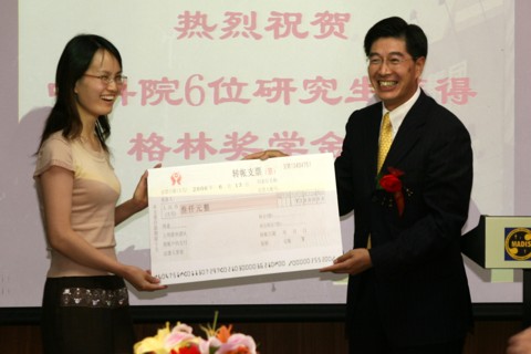 中科-格林期货指数产品发布会后,举行了中科院格林奖学金颁奖仪式。中国科学院数学与系统科学研究院的郑桂环、刘庆伟、谢雯和中国科学院研究生院管理学院的李自然、严妍、郭丽经过层层筛选和激烈的竞争获得了中科院格林奖学金。格林集团董事长王拴红先生向中科院的六名首届格林奖学金获奖学生颁发了证书和奖金,以奖励他们在经济分析与金融研究领域取得的突出成就。颁奖仪式由中科院数学与系统科学研究院副院长汪寿阳教授主持,中科院研究生院管理学院高鹏副院长在典礼上致辞,代表中科院有关方面感谢格林集团对中科院研究生教育事业的支持,祝贺获奖同学,并希望他们今后做出更大成绩。获奖学生代表郑桂环和阎妍表示,将再接再励,取得更多重要的研究成果。