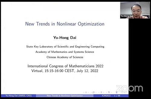 欧洲中部时间7月12日下午,中国科学院数学与系统科学研究院研究员戴彧虹在2022年国际数学家大会(ICM 2022)作45分钟邀请报告,报告题目为“New Trends in Nonlinear Optimization”,主要介绍了他本人及其与合作者在非线性优化方面的最新成果。