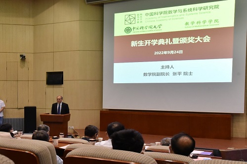 2022年9月24日上午,中国科学院数学与系统科学研究院(以下简称“数学院”)、中国科学院大学数学科学学院(以下简称“国科大数学学院”)2022年开学典礼暨颁奖大会在数学院思源楼报告厅举行。数学院院长兼国科大数学学院院长席南华院士、数学院学位评定委员会主任袁亚湘院士、数学院党委书记兼副院长武艰、数学院常务副院长高小山研究员、数学院纪委书记王敬泽、数学所所长徐晓平研究员、副所长付保华研究员,应用数学所所长骆顺龙研究员、计算数学所所长周爱辉研究员、系统所所长助理李洪波研究员、国科大数学学院执行副院长郭田德教授、国科大数学学院党委书记杨文国教授等院所领导出席本次开学典礼暨颁奖大会。此外,参会的还有研究生奖学金获得者以及部分学生代表、华罗庚班2019级的部分同学、斯伦贝谢公司特邀代表齐峰先生等。数学院副院长张平院士主持开学典礼。