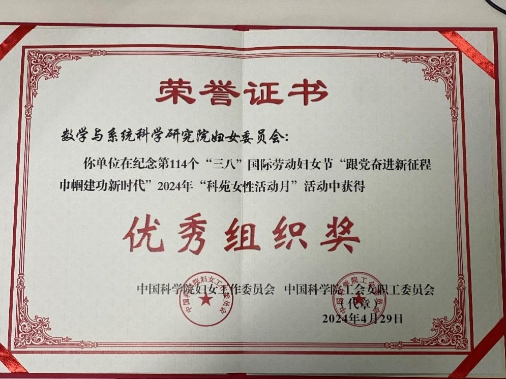 为隆重纪念第114个“三八”国际劳动妇女节,中国科学院妇女工作委员会、中国科学院工会女职工委员会按照全国妇联工作部署,在三月份组织开展了2024年“科苑女性活动月”活动。在近期的评选表彰中,数学院妇委会获得2024年“科苑女性活动月”优秀组织奖。