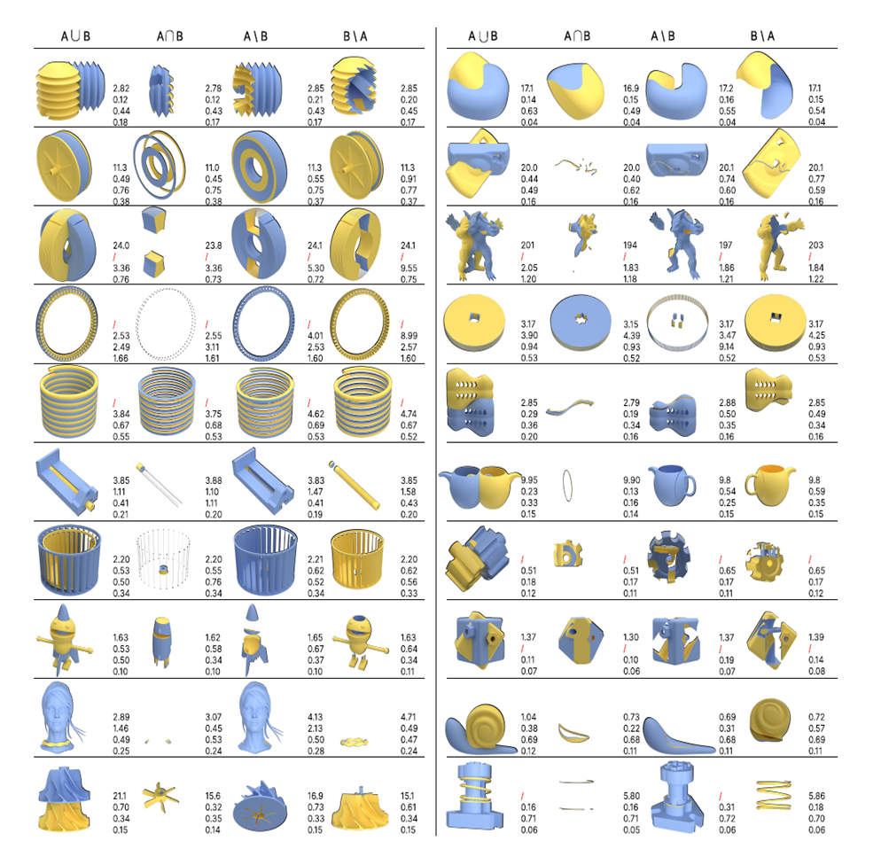 实体布尔运算是几何引擎中最重要的建模方式之一,其底层依赖于曲面求交、裁剪、分类和拓扑重构,对算法的拓扑稳定性、精度和效率的要求极高。近日,数学机械化实验室贾晓红研究员与其博士生杨滢瑜、杨婕吟与德国亚琛工业大学王博伦博士、山东大学辛士庆教授、自动化所严冬明研究员合作,基于实体模型的连续—离散混合表示,实现了高精高效的Brep模型的布尔运算。该工作被计算机图形学顶级会议ACM Siggraph接收,将发表于图形学顶级期刊ACM Transactions on Graphics。