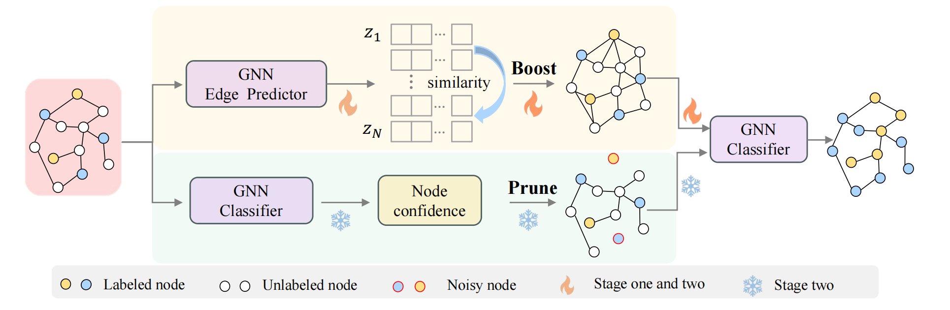 针对上述问题,中国科学院数学与系统科学研究院闫桂英团队基于理论分析提出了一种新型图神经网络模型——图拓扑自适应网络(Graph Topology Adaptive,GTA),通过引入EdgeBoost模块基于节点潜在空间相似性添加可信边,并结合EdgePrune模块利用优化筛选机制剔除不可信边,从而实现图拓扑的自适应调整与最终预测。理论分析与大量实验结果共同验证了GTA模型(框架图如下所示)在提升鲁棒性和泛化性能方面的有效性与优越性,相关研究成果已发表于国际人工智能领域顶级期刊《Knowledge-based Systems》。